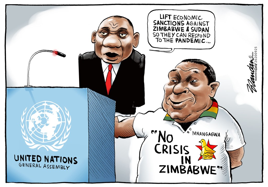 Business Day, Friday 25 September 2020 Posted on September 25, 2020 by Brandan Reynolds Reply Emmerson Mnangagwa praises Cyril Ramaphosa for condemning economic sanctions against Zimbabwe at the UN General Assembly.. Share this: Click to share on Facebook (Opens in new window) Facebook Click to share on X (Opens in new window) X Click to email a link to a friend (Opens in new window) Email Like Loading...