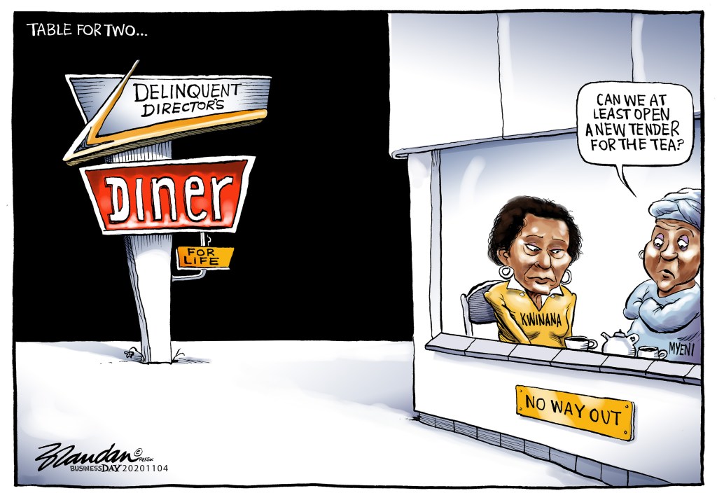 Business Day, Thursday 5 November 2020 Posted on November 5, 2020 by Brandan Reynolds Reply Former SAA chair and Zuma leuitenant Dudu Myeni refuses to answer questions form the Zondo Commission of Inquiry… Share this: Click to share on Facebook (Opens in new window) Facebook Click to share on X (Opens in new window) X Click to email a link to a friend (Opens in new window) Email Like Loading...