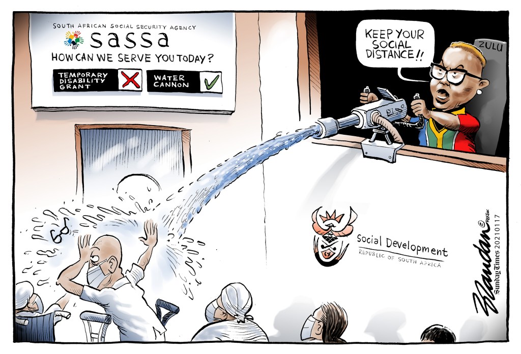 Water cannon used on beneficiaries being forced to reapply for a temporary disability grant who weren’t social distancing enough…