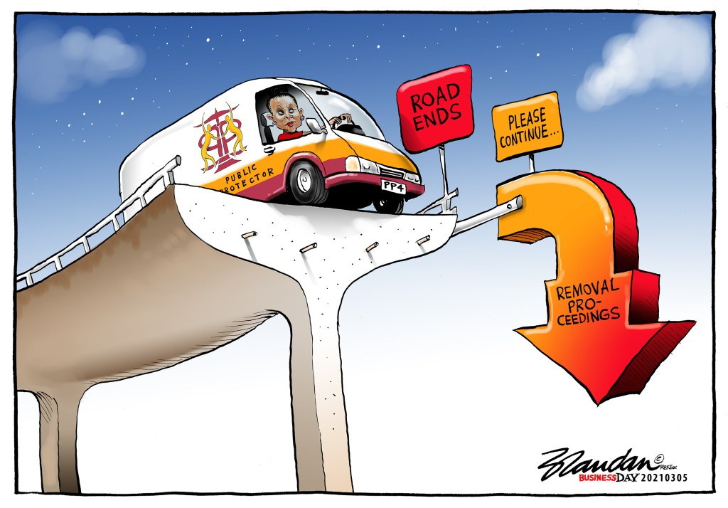 Business Day, Friday 5 March 2021 Posted on March 5, 2021 by Brandan Reynolds End of the road for Public Protector Busisiwe Mkhwebane as parliament mulls removal proceedings… Share this: Click to share on Facebook (Opens in new window) Facebook Click to share on X (Opens in new window) X Click to email a link to a friend (Opens in new window) Email Like Loading...