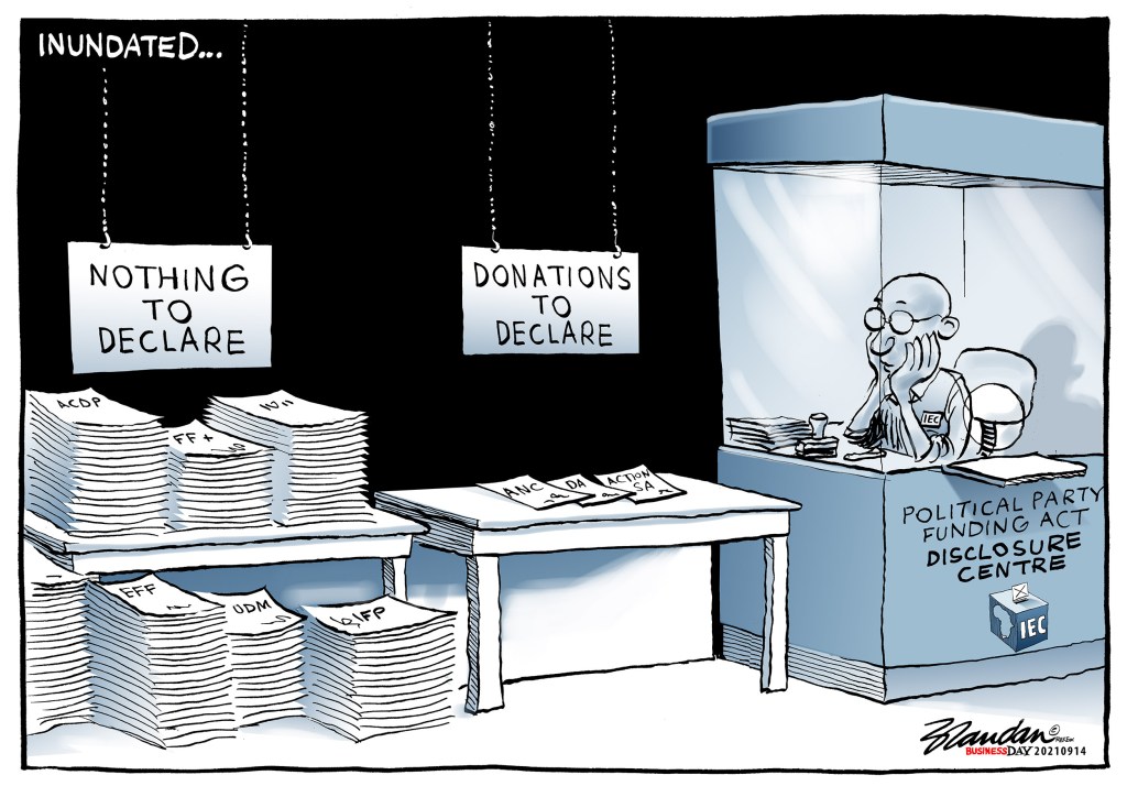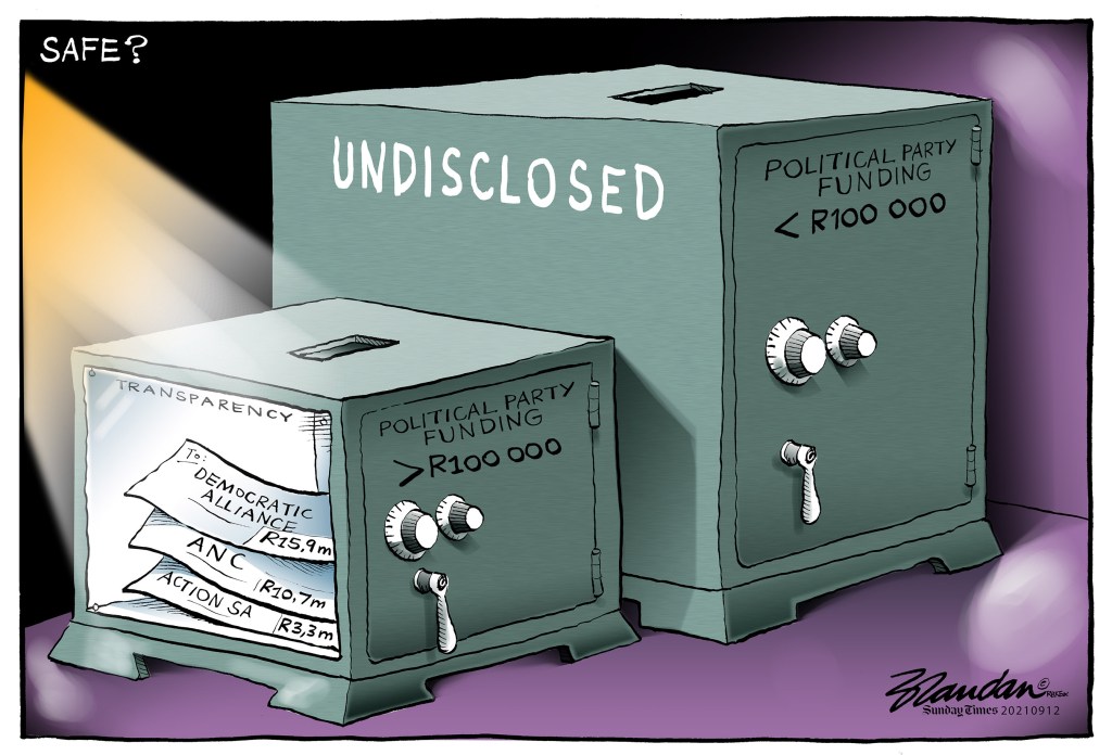 Business Day, Tuesday 14 September 2021 Posted on September 14, 2021 by Brandan Reynolds Reply SA still in the dark about political party donations despite new legislation… Share this: Click to share on Facebook (Opens in new window) Facebook Click to share on X (Opens in new window) X Click to email a link to a friend (Opens in new window) Email Like Loading...