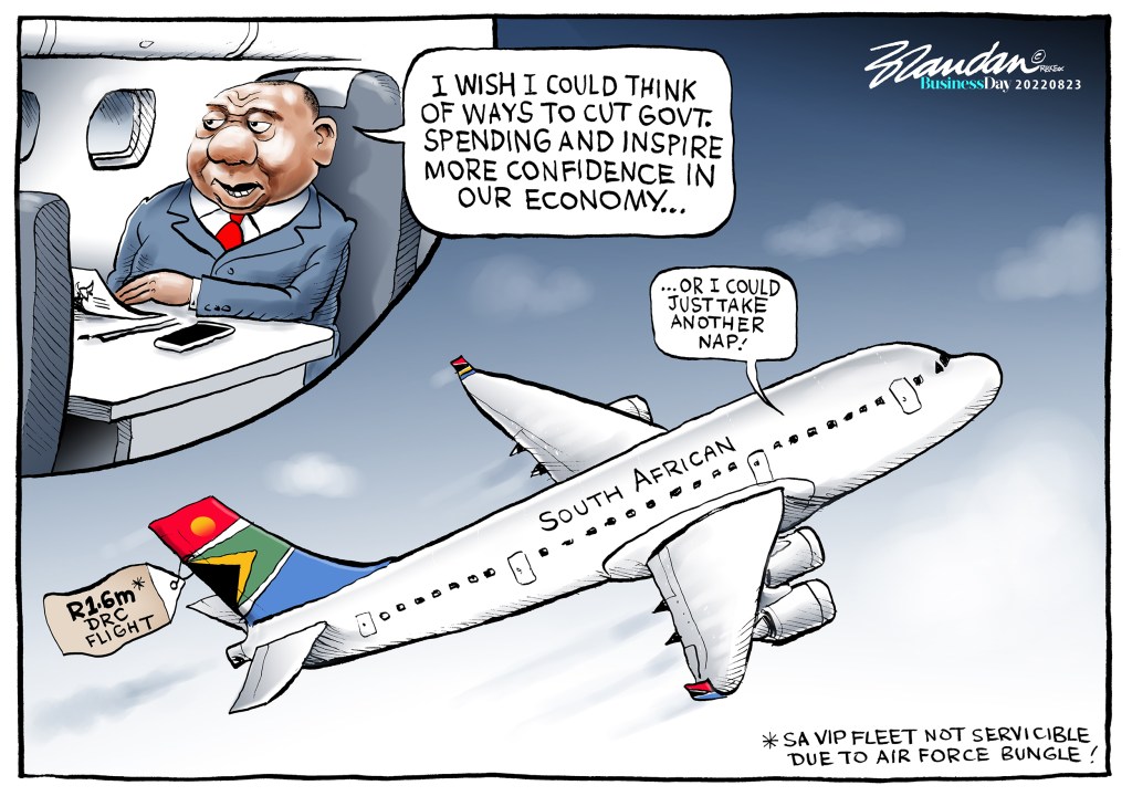 Business Day, Tuesday 23 August 2022 Posted on August 23, 2022 by Brandan Reynolds Ramaphosa criticised for chartering SAA flight to get to SADC summit in Kinshasa, DRC… Share this: Click to share on Facebook (Opens in new window) Facebook Click to share on X (Opens in new window) X Click to email a link to a friend (Opens in new window) Email Like Loading...