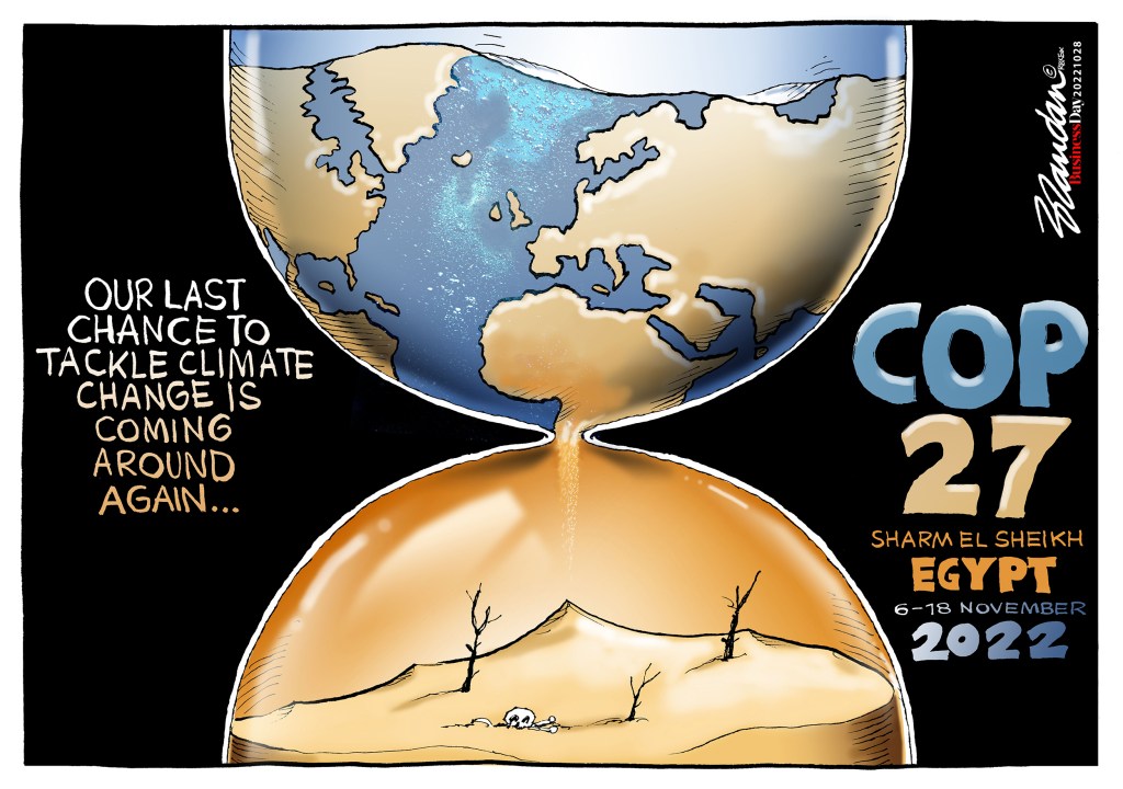Business Day, Friday 28 October 2022 Posted on October 28, 2022 by Brandan Reynolds #COP27 Share this: Click to share on Facebook (Opens in new window) Facebook Click to share on X (Opens in new window) X Click to email a link to a friend (Opens in new window) Email Like Loading...