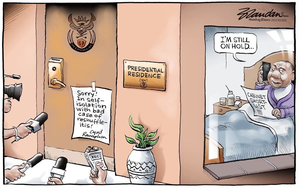 Sunday Times 5 March 2023 Posted on March 6, 2023 by Brandan Reynolds President Cyril Ramaphosa to finally to announce long-awaited changes to his cabinet… Share this: Click to share on Facebook (Opens in new window) Facebook Click to share on X (Opens in new window) X Click to email a link to a friend (Opens in new window) Email Like Loading...