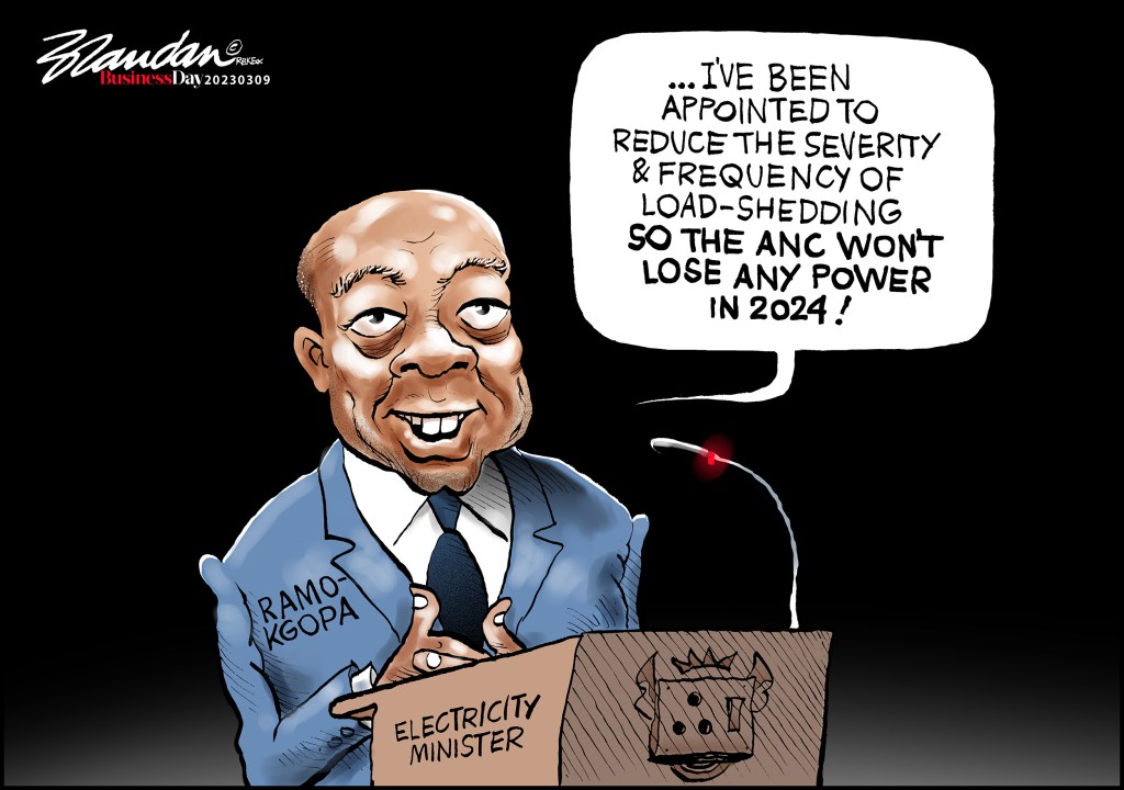 Business Day, Thursday 9 March 2023 Posted on March 9, 2023 by Brandan Reynolds Sputla Ramokgopa sworn-in as new Electricity Minister, or is that Minister Without Portfolio?… Share this: Click to share on Facebook (Opens in new window) Facebook Click to share on X (Opens in new window) X Click to email a link to a friend (Opens in new window) Email Like Loading...