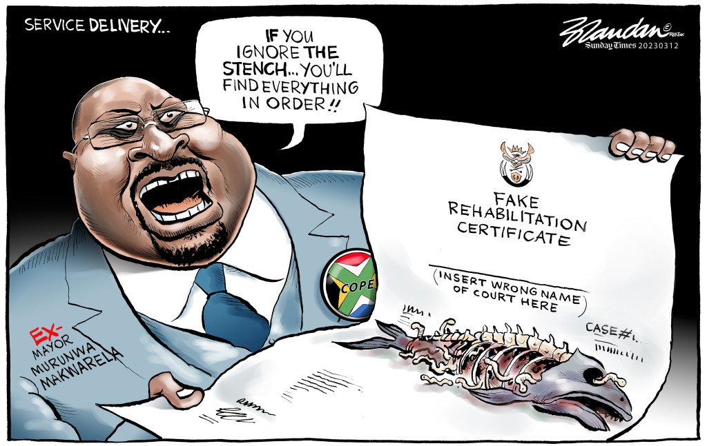 Sunday Times 12 March 2023 Posted on March 12, 2023 by Brandan Reynolds Tshwane Mayor Murunwa Makwarela resigns after fake certificate scandal… Share this: Click to share on Facebook (Opens in new window) Facebook Click to share on X (Opens in new window) X Click to email a link to a friend (Opens in new window) Email Like Loading...