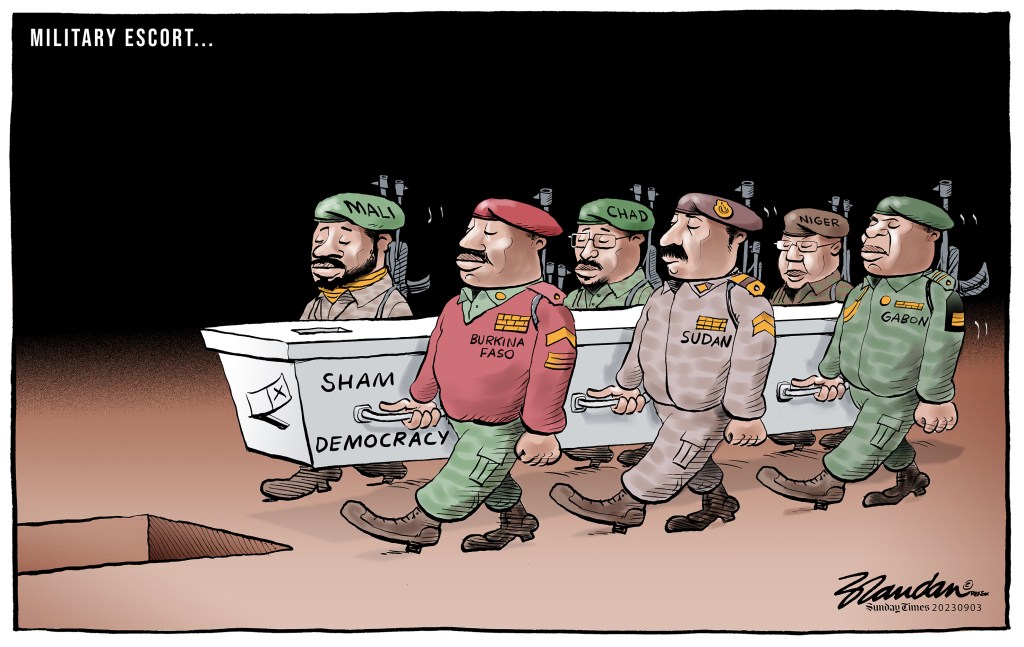 Sunday Times 3 September 2023 Posted on September 3, 2023 by Brandan Reynolds Sham African democracies get a military escort… Share this: Click to share on Facebook (Opens in new window) Facebook Click to share on X (Opens in new window) X Click to email a link to a friend (Opens in new window) Email Like Loading...