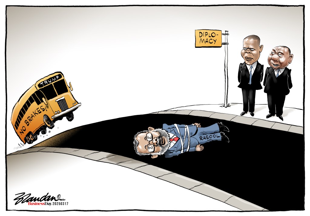 Business Day, Monday 17 March 2025 Posted on March 17, 2025 by Brandan Reynolds US expels SA Ambassador Ebrahim Rasool after undiplomatic comments about Trump administration… Share this: Click to share on Facebook (Opens in new window) Facebook Click to share on X (Opens in new window) X Click to email a link to a friend (Opens in new window) Email Like Loading...
