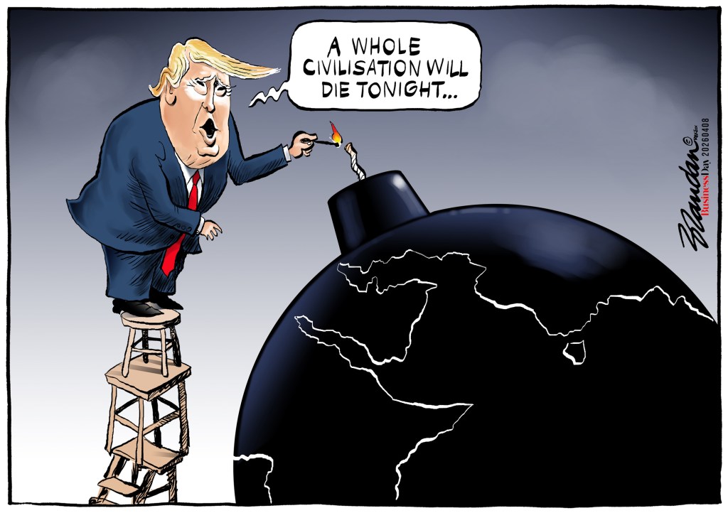 Business Day, Wednesday 8 April 2026 Posted on April 8, 2026 by Brandan Reynolds World at risk as Trump threatens Iran… Share this: Share on Facebook (Opens in new window) Facebook Share on X (Opens in new window) X Email a link to a friend (Opens in new window) Email Like Loading...