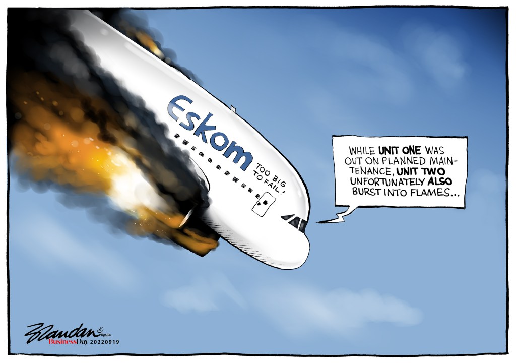Business Day, Wednesday 14 September 2022 Posted on September 14, 2022 by Brandan Reynolds Reply Eskom continues to crumble despite the much touted “reliability maintenance” programme… Share this: Click to share on Facebook (Opens in new window) Facebook Click to share on X (Opens in new window) X Click to email a link to a friend (Opens in new window) Email Like Loading...