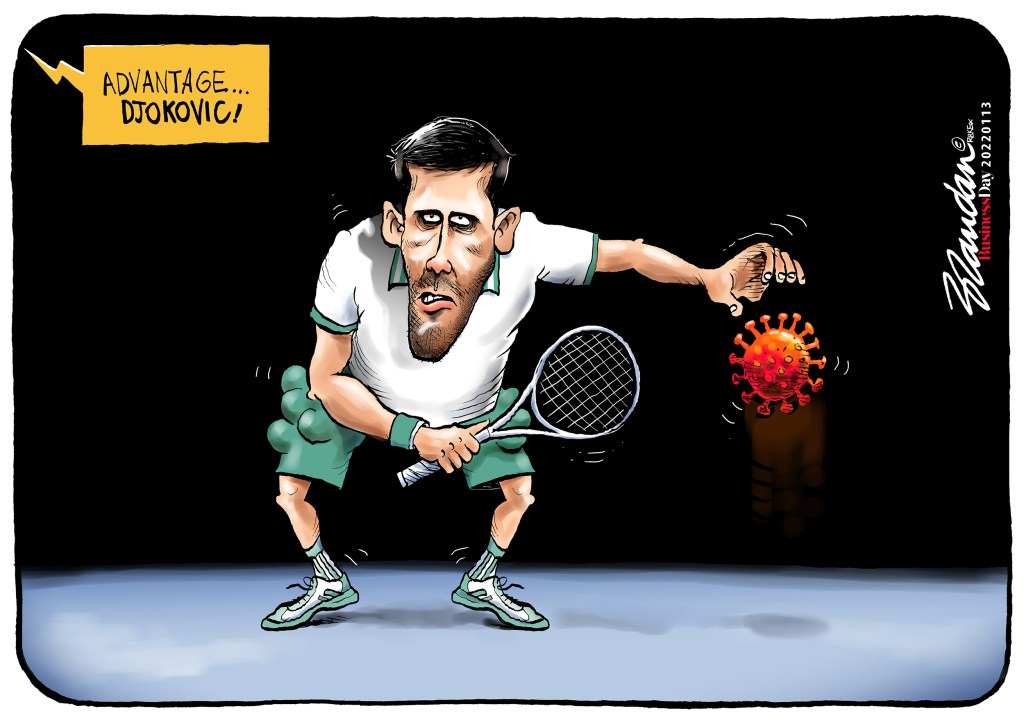 Business Day, Thursday 13 January 2022 Posted on January 13, 2022 by Brandan Reynolds Reply Novak Djokovic more equal than others in Australian Open visa debacle… Share this: Click to share on Facebook (Opens in new window) Facebook Click to share on X (Opens in new window) X Click to email a link to a friend (Opens in new window) Email Like Loading...